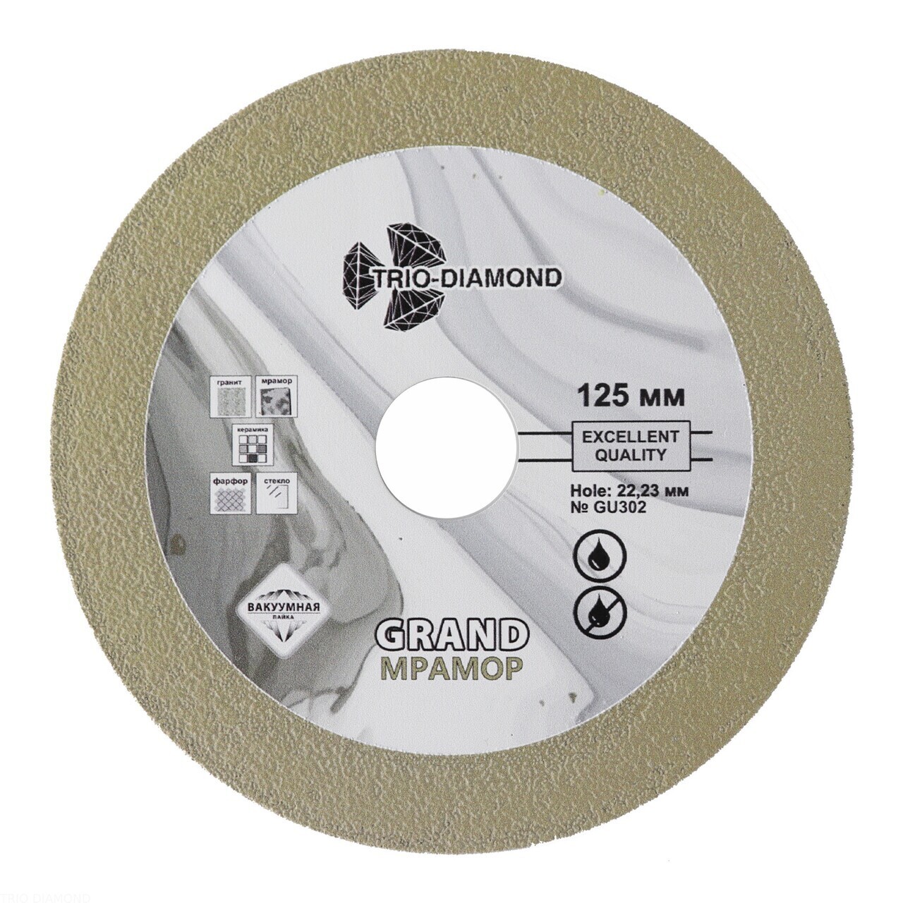 Особенности: универсальный алмазный отрезной диск вакуумной пайки со сплошной режущей кромкой, подходит для работы с натуральным и искусственным камнем, а также стеклом. Технология производства: вакуумная пайка.
