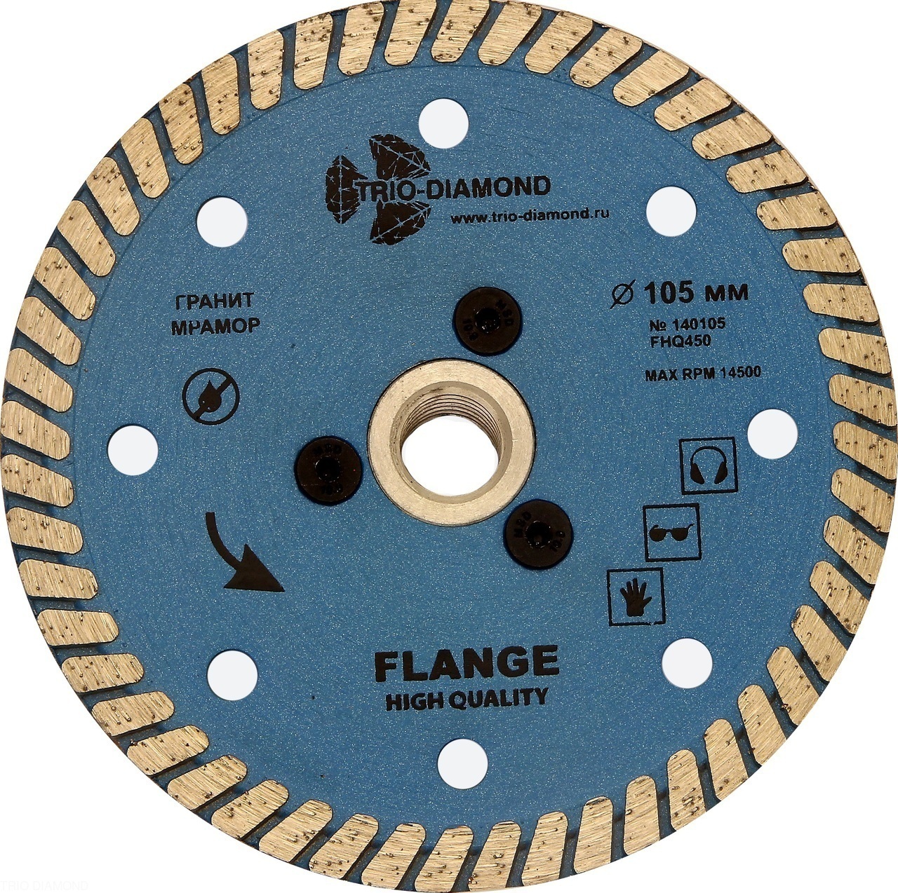 Особенности: фланец М-14 не только позволяет устанавливать данный диск на УШМ без зажимной гайки, но и значительно усиливает корпус диска, что дает возможность работать с материалом под любым углом, создавая дополнительные возможности в работе.