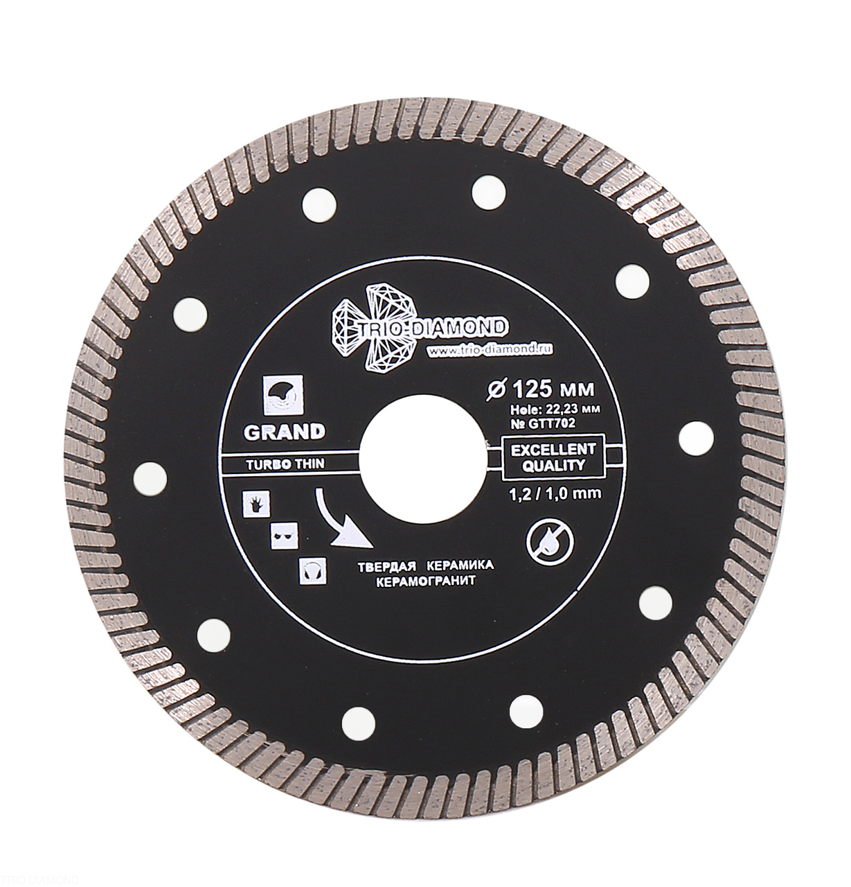 Особенности: диски с мелко рифлёной кромкой, горячего прессования, с компенсационными отверстиями. Данные особенности конструкции позволяют работать без водяного охлаждения по керамограниту, без сколов.