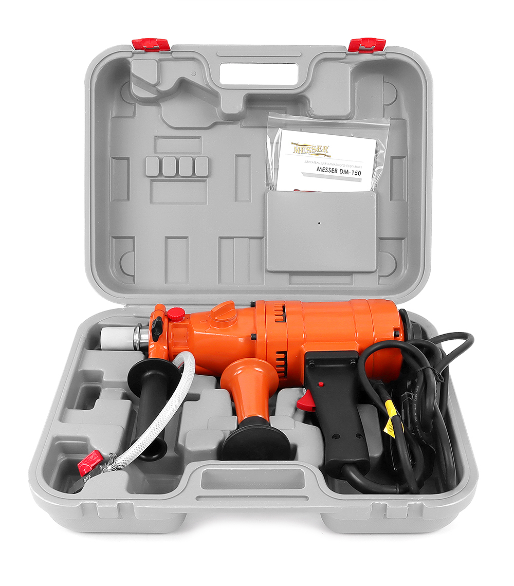 Двигатель алмазного бурения MESSER DM-150 предназначен для алмазного бурения бетона, кирпича и камня, как с использованием стойки, так и для работы с рук. Для «ручной» работы двигатель имеет съемный удобный плечевой упор и большую боковую рукоять, обеспечивающую надежный хват. Сняв плечевой упор и используя соответствующий хомут, двигатель можно закрепить на стойку.