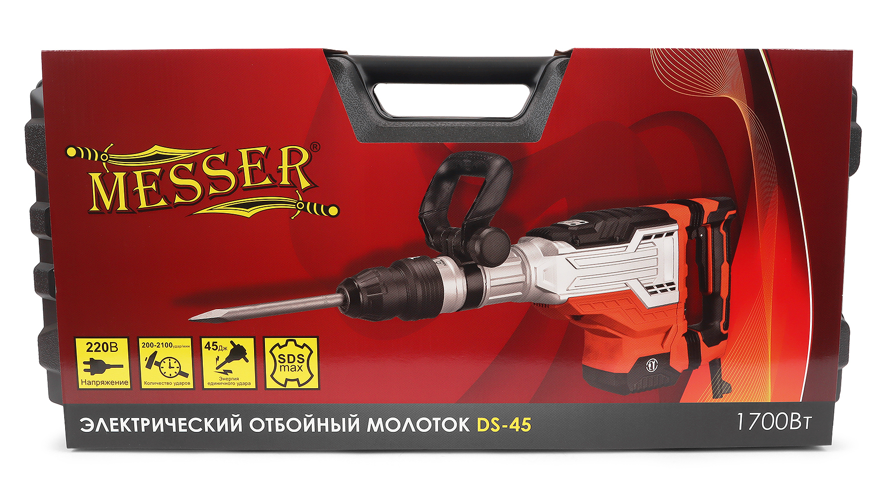 Отбойный молоток MESSER DS-45, с двигателем 1700 Вт., силой единичного удара 45 Дж., регулируемым количеством ударов от 200 до 2100 в минуту, патроном SDS-maх и весом 11 кг. Отбойный молоток MESSER DS-45 предназначен для выполнения большого объема работ по разрушению конструкций из бетона, кирпича, камня и других подобных строительных материалов , разрушению межэтажных перекрытий, вскрытию асфальтовых и железобетонных покрытий.