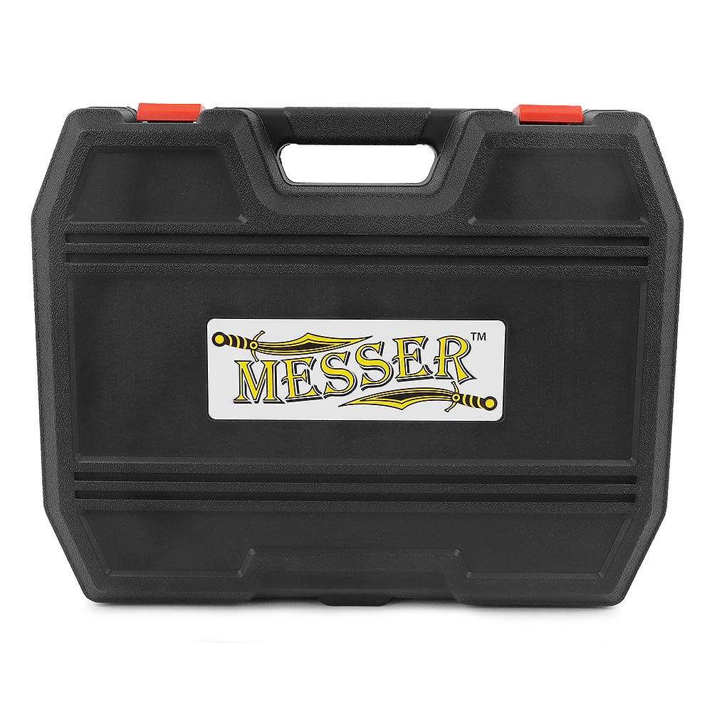 Заклепочник MESSER PCR144A (серия 2021) поставляется в удобном пластиковом кейсе для транспортировки и хранения инструмента. Комплектуется набором сменных насадок для разных диаметров заклепок, двумя прозрачными пластиковыми контейнерами для сбора хвостовиков заклепок, а также гаечным ключом для обслуживания заклепочника.