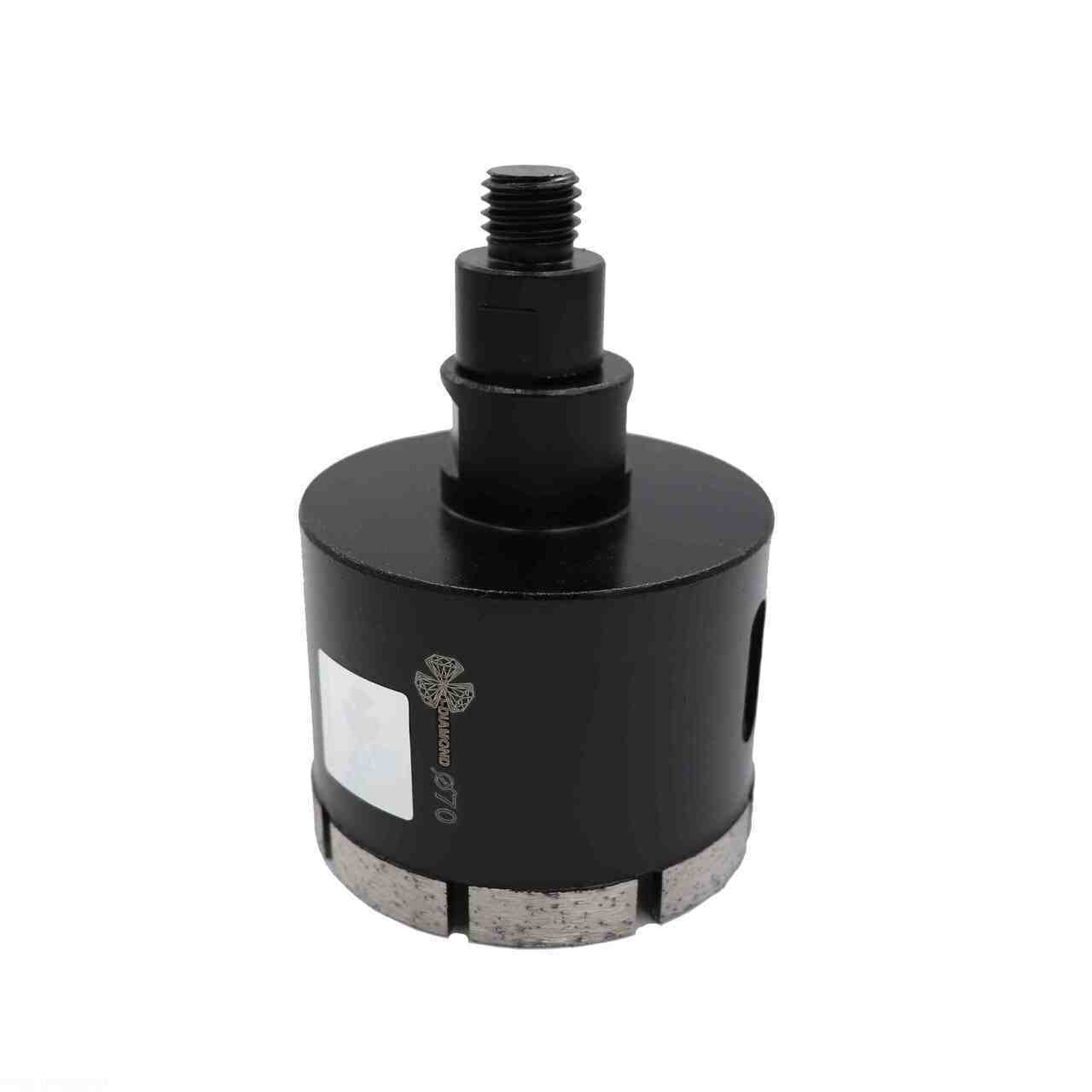 Особенности: коронка оснащена съемным цилиндрическим хвостовиком с резьбовым соединением М14, что позволяет высверливать отверстия с помощью дрелей и УШМ. Для работ с водяным охлаждением в безударном режиме.