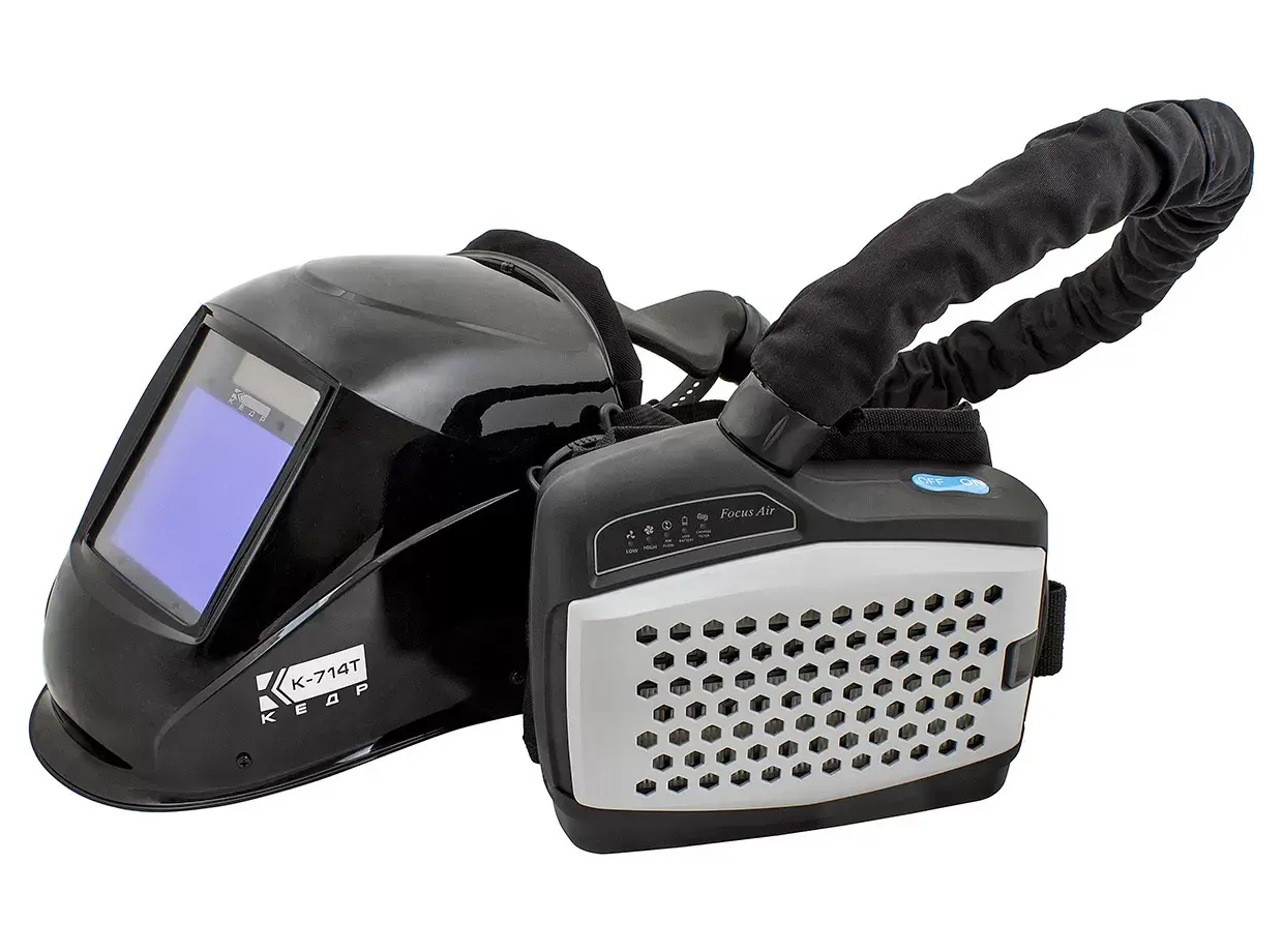 Маска сварщика КЕДР К-704Т PRO с ТУРБОБЛОКОМ, черная — предназначена для защиты глаз от опасного и вредного излучения дуги и защиты органов дыхания от пыли, сварочных дымов, других аэрозолей.