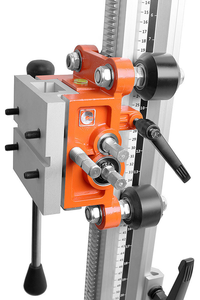 Стойка MESSER SА-400 для установок алмазного бурения, позволяющая работать алмазными коронками диаметром до 400 мм. Крепление двигателя осуществляется с помощью быстросъемной плиты. Многофункциональный штурвал может быть использован для регулировки узлов стойки. Стойка позволяет производить бурение под наклоном до 45 градусов. Рейка из алюминиевого сплава заметно уменьшает вес стойки. Прорезиненные транспортировочные колеса облегчают перемещение установки. Пузырьковый уровень помогает точно выставить установку, что не допустить излишнего износа и закусывания алмазной коронки. Рекомендована к использованию с двигателем MESSER DM-350, но также может применяться с двигателями других производителей.